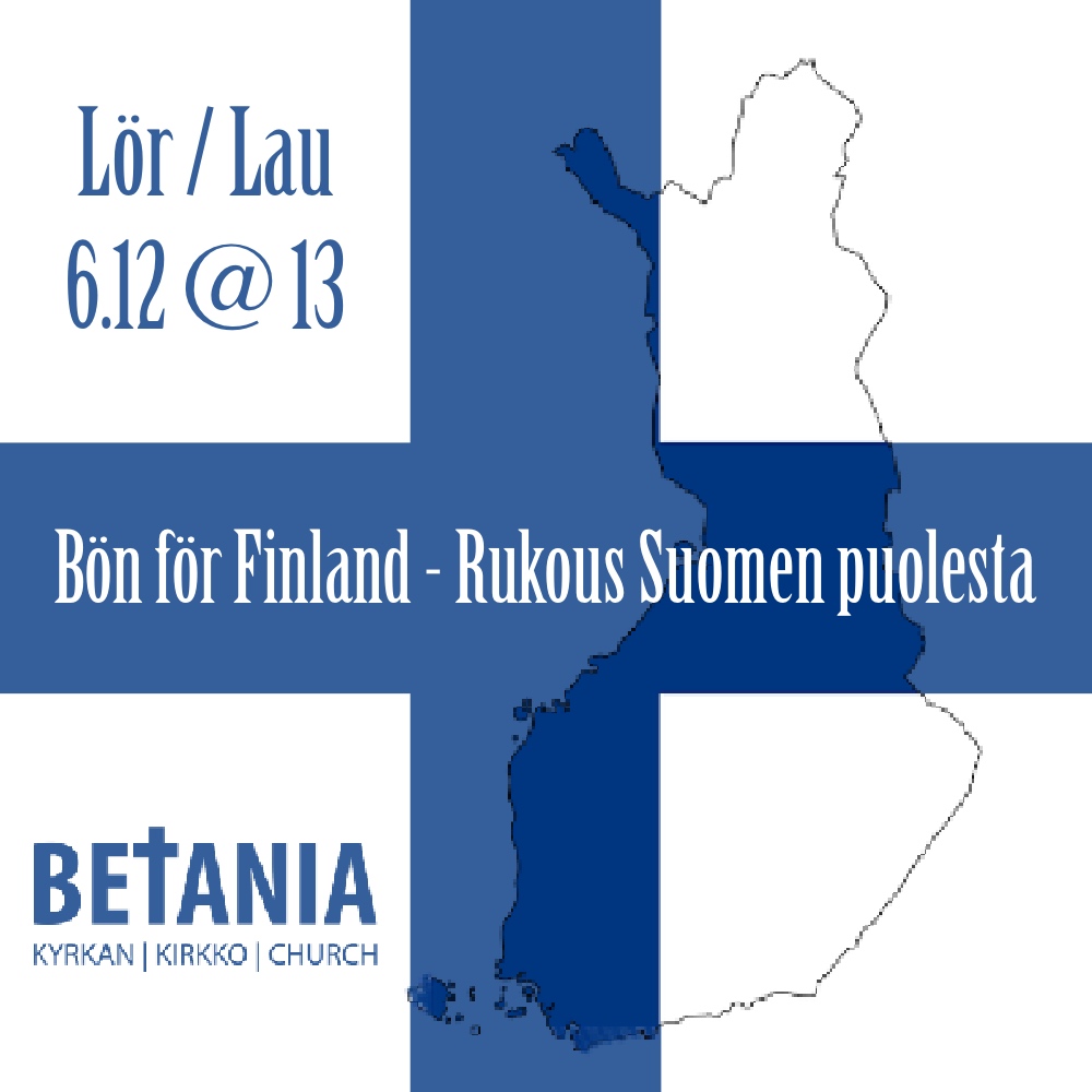 Vi ber för Finland – med alla tänkbara infallsvinklar. Du som vill vara med och be för Finlands folk och situation specifikt på självständighetsdagen är varmt välkommen! Mary och Raili är initiativtagare och är med och leder ”Bön för Finland” samlingen i Betania.
