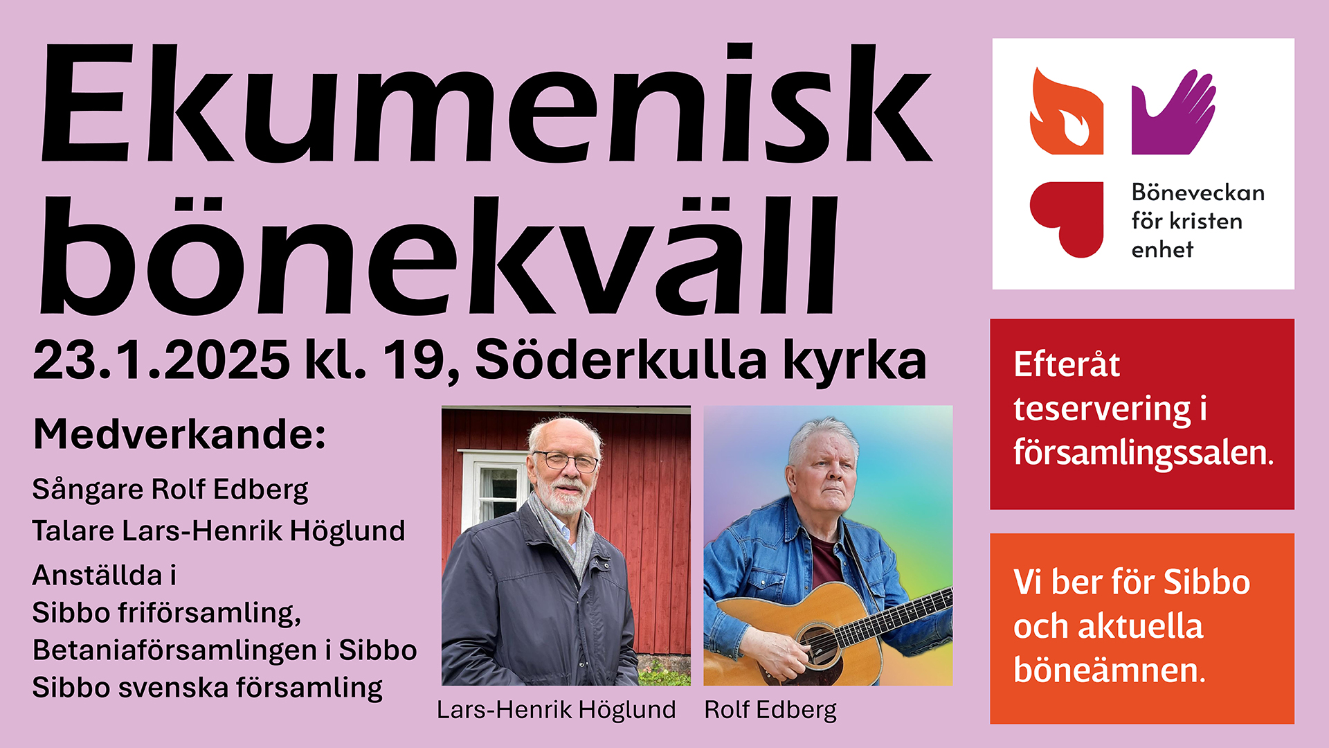 Ekumenisk bönekväll i Söderkulla kyrka 27 december 202422 januari 2025 av Betania Evenemangsdetaljer Datum: 23 januari 2025 19:00 – 20:30 Kategorier: Gudstjänst, Svenska Årets ekumeniska bönekväll hålls i Söderkulla kyrka på torsdag 23 januari kl. 19. Relaterade Relaterade artiklarAnders Olin: Med Jesus i…Med Jesus i stormen –…Hopp i hopplöshet – Maria…Vinterutflykt för hela familjen –…Nostakaa silmänne – Nils-Gustav BlomSamtid och framtid, del 1…
