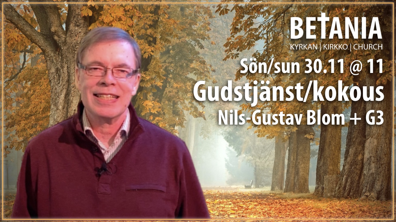 Gudstjänst / kokous – Nils-Gustav Blom 26 oktober 20253 november 2025 av Betania Evenemangsdetaljer Datum: 30 november 2025 11:00 – 12:30 Kategorier: Gudstjänst, Suomeksi, Svenska Välkommen till Betaniakyrkan på söndag 30.11 kl. 11! Tervetuloa kokoukseen 30.11 klo 11 Betania-kirkkoon! Tulkkaus kuulokkeisiin. Nils-Gustav Blom predikar. Grupp 3 ansvarig Relaterade Relaterade artiklarSamling för män 26 november…FarsdagslunchKonsert med Nina ÅströmMusikverkstanGod Jul Sibbo 2025Paulus och Jesus – G.Grönroos