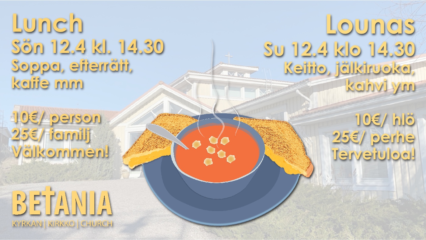 Lunch – Lounas 4 april 2026 av Betania Evenemangsdetaljer Datum: 12 april 2026 14:30 – 15:30 Kategorier: Suomeksi, Svenska, Verksamhet Välkommen på lunch i Betania! Tervetuloa lounaalle yhdessä monen ystävän kanssa! Sön/Su 12.4 @ 14.30. 10 €/person/hlö, (25 € fam./perhe) Relaterade Relaterade artiklarJesus i den judiska påskmåltidenDu är kallad med en…Påsken i BetaniaUsko – miksi niin tärkeää?…Prenumerera på vår tidningÅret i pingstförsamlingarna