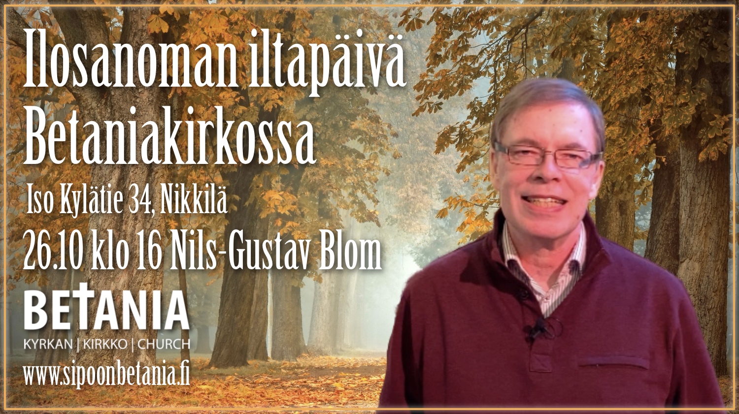 Tervetuloa Betaniakirkkoon sunnuntaina 26.10 klo 16 – Ilosanoman iltapäivä – Nils Gustav Blom + Ryhmä 5. (Suomenkielinen kokous)
