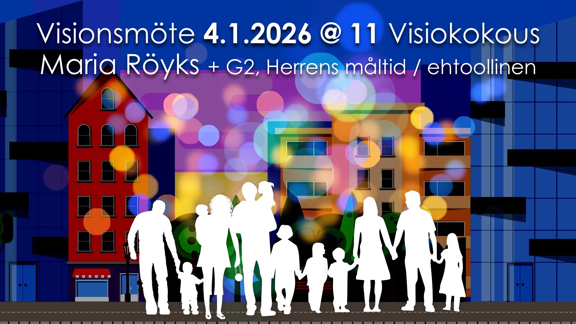 Visionsmöte / visiokokous – Maria Röyks 13 November 2025 by Betania Event Details Date: 4 January 2026 11:00 – 13:00 Categories: Gudstjänst, Suomeksi, Svenska Välkommen till Betania på söndag 4 januari 2026 kl. 11 / Tervetuloa kokoukseen sunnuntaina 4.1.26 klo 11! Visionsmöte med Maria Röyks + G2 m.fl. Herrens måltid. Efteråt fika. Visiokokous – Maria Röyks, G2 ym. Ehtoollinen. Jälkeenpäin fiika. Relaterade