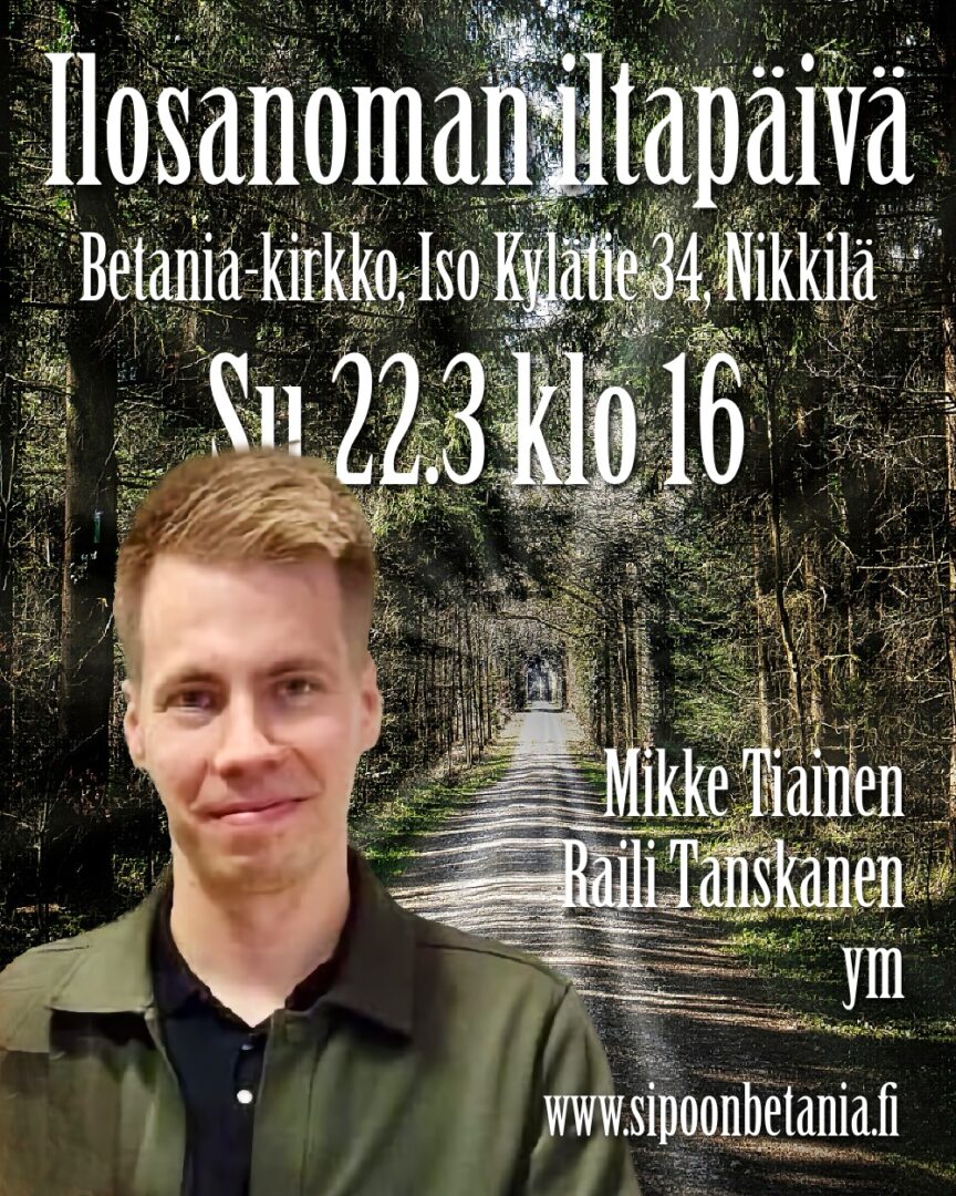 Kk:n 4. sunnuntai on varattu Ilosanoman iltapäivälle. Silloin järjestämme suomenkielisen tilaisuuden Betania-kirkossa. Sunnuntaina 22.3 klo 16 puhuu Mikke Tiainen (nuorisopastori Malmin Saalemista). Mukana nuorten ryhmä musiikissa. Tilaisuuden jälkeen fiika (eli kahvi- ym tarjoilu) juhlasalissa.