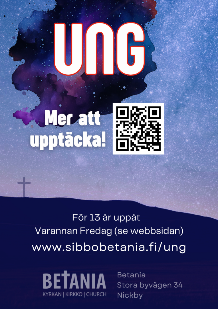 UNG är en plats för dig som är 13 år uppåt och vill träffa andra ungdomar. Vi träffas i Betania, Nickby (Stora byvägen 34), och umgås, äter, spelar spel och talar om vad Gud har för tankar och planer för ditt liv.